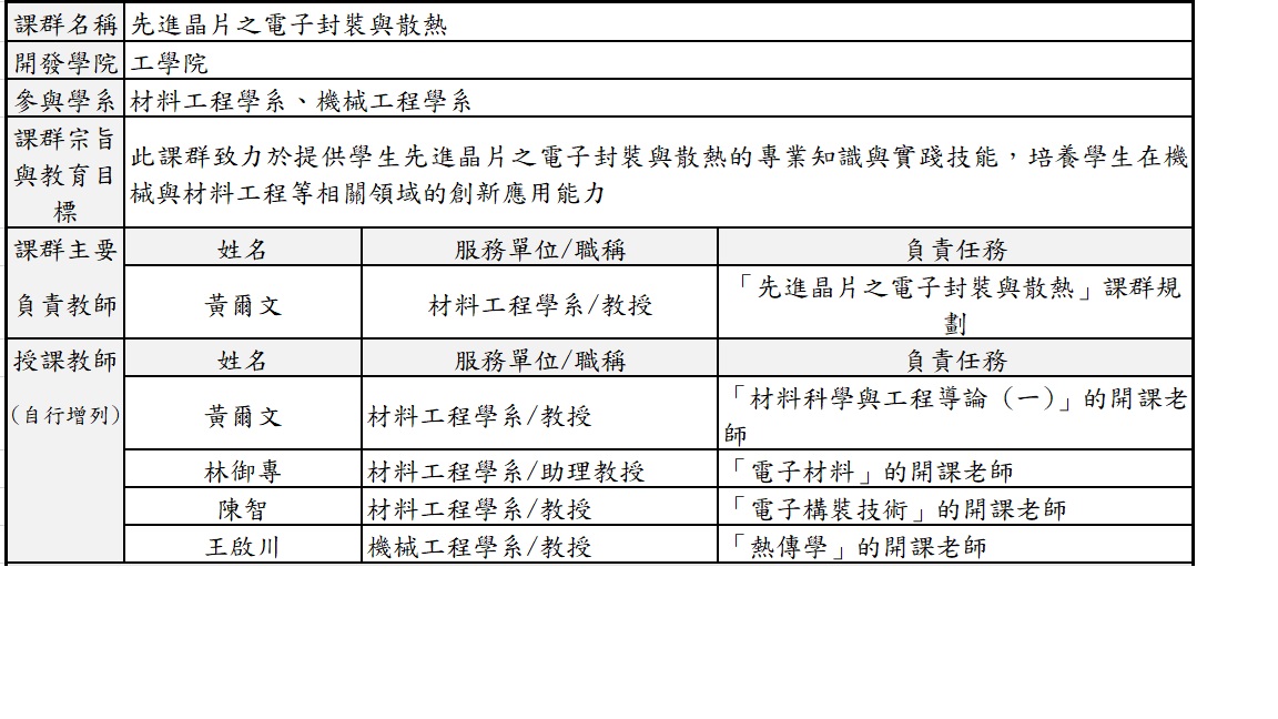 為應對半導體與高效能運算需求,先進晶片電子封裝與散熱課群結合材料工程與機械工程學系的多門課程,涵蓋材料科學、電子材料、封裝技術及熱傳學等,構建完整知識體系。隨著人工智慧與晶片性能的發展,垂直堆疊封裝技術(如CoWoS、SoIC)成為焦點,散熱技術的提升至關重要。本課群從材料性能與製程基礎出發,深入封裝理論與實踐,並注重熱傳導與散熱技術,培養學生在電子封裝與散熱領域的創新能力與實務技能。此課群不僅符合產業需求,還加強學生在半導體產業中的專業競爭力,為未來科技挑戰奠定基礎。