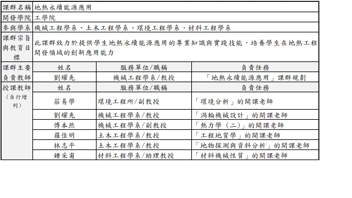 課群二:地熱永續能源應用(劉耀先) 為應對全球能源轉型與台灣潔淨能源發展需求,地熱能源課群旨在培養學生在地熱系統設計與實作方面的專業能力。課群結合機械、土木、環境工程與材料科學等領域,涵蓋地熱潛能區域分析、地物探測、工程地質學、熱力學、渦輪機械設計及材料機械性質等課程,為學生提供完整的知識體系與實踐機會。課程強調數值分析、實驗測試及實地探訪,幫助學生將理論應用於地熱系統開發,提升解決能源技術挑戰的能力。此課群將有助於台灣地熱產業發展,並為全球能源變革培養具領導力的專業人才。