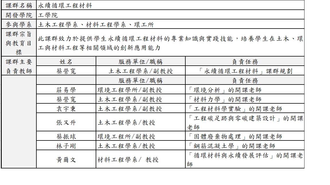 為應對全球資源有限與環境污染挑戰,永續循環工程材料課群旨在支持台灣循環經濟與永續發展戰略。課群設計涵蓋理論學習與實務應用,課程包括材料力學、鋼筋混凝土學、環境分析、固體廢棄物處理等,強調廢棄物再利用與資源管理。進階課程如工程碳足跡與零碳建築設計,培養學生的系統性思考與創新解決能力。課群整合無機聚合物等循環材料技術,並導入生命週期評估(LCA)與碳足跡計算等工具,提升學生在全球循環經濟中的競爭力。課群跨領域設計,結合機械、材料、土木與環境工程,推動學生綜合能力與實務應用,為未來綠色工程與環境保護貢獻力量。